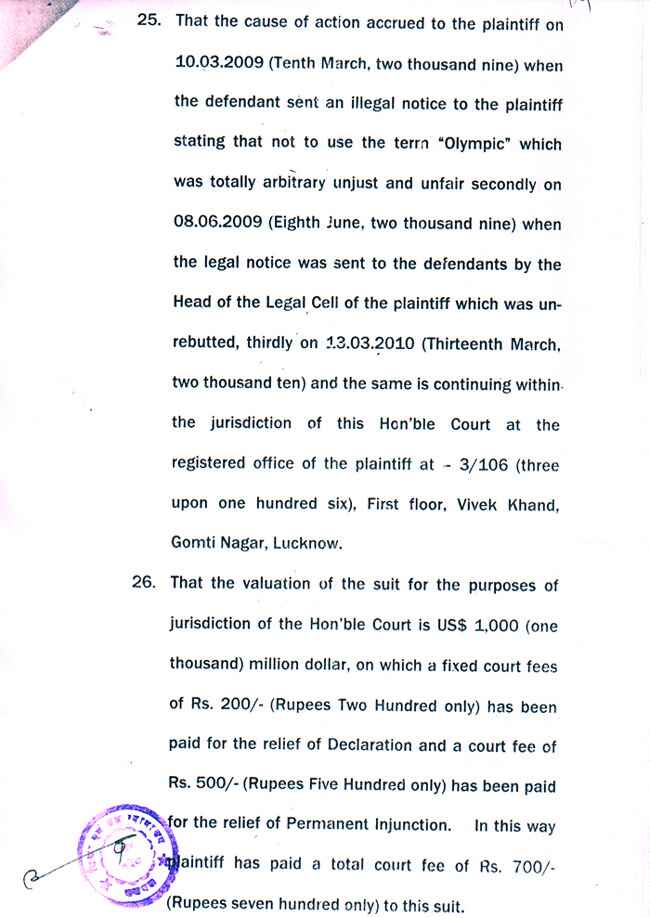 The INOC has filed a legal suit against IOC, Court has issued notices to IOC, in response to petition by its Secretary General Mr. Mahammed Seraj ANSARI. The plaintiff contended that a permanent injunction be passed against IOC not to interfere in sports activities of the INOC. INOC has sought a compensation of US $ 1000 million as compensation from the IOC. The suit no. 743/2010 filed on dated. 17th July-2010, and hearded on 19th July-2010, and date of next hearing 03 July-2010.